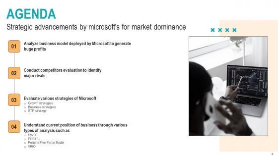 Boost your pitch with our creative Agenda Strategic Advancements By Microsofts For Market Dominance Diagrams Pdf. Deliver an awe-inspiring pitch that will mesmerize everyone. Using these presentation templates you will surely catch everyones attention. You can browse the ppts collection on our website. We have researchers who are experts at creating the right content for the templates. So you do not have to invest time in any additional work. Just grab the template now and use them. Our Agenda Strategic Advancements By Microsofts For Market Dominance Diagrams Pdf are topically designed to provide an attractive backdrop to any subject. Use them to look like a presentation pro.