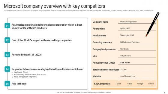 This slide shows an overview of Microsoft corporations along with its major products and services. Other components covered in this slide are founding date, headquarters, founding members, revenue, employee count, major competitors etc. Slidegeeks has constructed Microsoft Company Overview With Key Competitors Strategic Advancements By Microsofts Themes Pdf after conducting extensive research and examination. These presentation templates are constantly being generated and modified based on user preferences and critiques from editors. Here, you will find the most attractive templates for a range of purposes while taking into account ratings and remarks from users regarding the content. This is an excellent jumping-off point to explore our content and will give new users an insight into our top-notch PowerPoint Templates. This slide shows an overview of Microsoft corporations along with its major products and services. Other components covered in this slide are founding date, headquarters, founding members, revenue, employee count, major competitors etc.