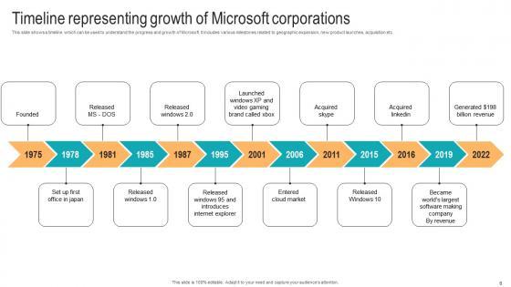 This slide shows a timeline which can be used to understand the progress and growth of Microsoft. It includes various milestones related to geographic expansion, new product launches, acquisition etc. Are you in need of a template that can accommodate all of your creative concepts This one is crafted professionally and can be altered to fit any style. Use it with Google Slides or PowerPoint. Include striking photographs, symbols, depictions, and other visuals. Fill, move around, or remove text boxes as desired. Test out color palettes and font mixtures. Edit and save your work, or work with colleagues. Download Timeline Representing Growth Of Microsoft Strategic Advancements By Microsofts Graphics Pdf and observe how to make your presentation outstanding. Give an impeccable presentation to your group and make your presentation unforgettable. This slide shows a timeline which can be used to understand the progress and growth of Microsoft. It includes various milestones related to geographic expansion, new product launches, acquisition etc.
