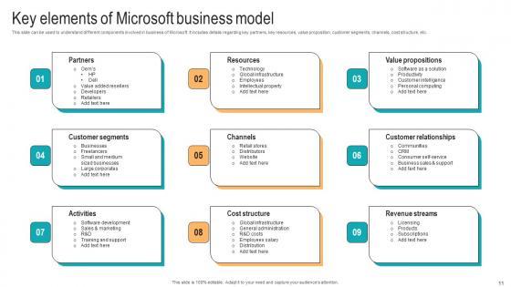 This slide can be used to understand different components involved in business of Microsoft. It includes details regarding key partners, key resources, value proposition, customer segments, channels, cost structure, etc. Make sure to capture your audiences attention in your business displays with our gratis customizable Key Elements Of Microsoft Business Model Strategic Advancements By Microsofts Microsoft Pdf. These are great for business strategies, office conferences, capital raising or task suggestions. If you desire to acquire more customers for your tech business and ensure they stay satisfied, create your own sales presentation with these plain slides. This slide can be used to understand different components involved in business of Microsoft. It includes details regarding key partners, key resources, value proposition, customer segments, channels, cost structure, etc.