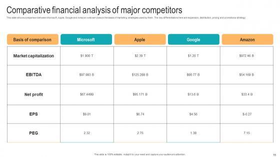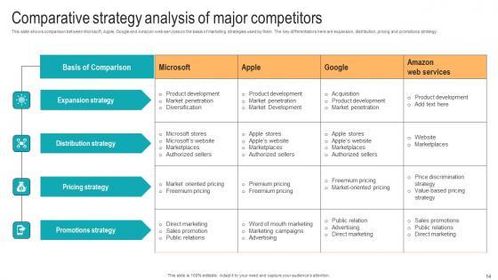 This slide shows comparison between Microsoft, Apple, Google and Amazon web services on the basis of marketing strategies used by them. The key differentiators here are expansion, distribution, pricing and promotions strategy. From laying roadmaps to briefing everything in detail, our templates are perfect for you. You can set the stage with your presentation slides. All you have to do is download these easy-to-edit and customizable templates. Comparative Financial Analysis Of Major Strategic Advancements By Microsofts Introduction Pdf will help you deliver an outstanding performance that everyone would remember and praise you for. Do download this presentation today. This slide shows comparison between Microsoft, Apple, Google and Amazon web services on the basis of marketing strategies used by them. The key differentiators here are expansion, distribution, pricing and promotions strategy.