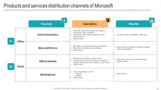 This slide shows distribution strategy used by Microsoft to sell its product services through different channels which are authorized sellers, Microsoft stores, official website and marketplaces. It also includes benefits of selling through each channel. Slidegeeks is one of the best resources for PowerPoint templates. You can download easily and regulate Products And Services Distribution Channels Strategic Advancements By Microsofts Summary Pdf for your personal presentations from our wonderful collection. A few clicks is all it takes to discover and get the most relevant and appropriate templates. Use our Templates to add a unique zing and appeal to your presentation and meetings. All the slides are easy to edit and you can use them even for advertisement purposes. This slide shows distribution strategy used by Microsoft to sell its product services through different channels which are authorized sellers, Microsoft stores, official website and marketplaces. It also includes benefits of selling through each channel.