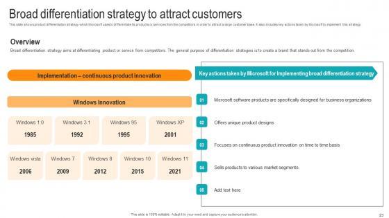 This slide shows product differentiation strategy which Microsoft uses to differentiate its products or services from the competitors in order to attract a large customer base. It also includes key actions taken by Microsoft to implement this strategy. There are so many reasons you need a Broad Differentiation Strategy To Attract Strategic Advancements By Microsofts Brochure Pdf. The first reason is you can not spend time making everything from scratch, Thus, Slidegeeks has made presentation templates for you too. You can easily download these templates from our website easily. This slide shows product differentiation strategy which Microsoft uses to differentiate its products or services from the competitors in order to attract a large customer base. It also includes key actions taken by Microsoft to implement this strategy.
