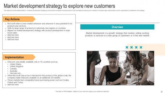 This slide shows the implementation of market development strategy by Microsoft to increase or boost product or service sales by entering new markets. It includes major actions taken by the organization to implement this strategy. The best PPT templates are a great way to save time, energy, and resources. Slidegeeks have 100 percent editable powerpoint slides making them incredibly versatile. With these quality presentation templates, you can create a captivating and memorable presentation by combining visually appealing slides and effectively communicating your message. Download Market Development Strategy To Explore New Strategic Advancements By Microsofts Download Pdf from Slidegeeks and deliver a wonderful presentation. This slide shows the implementation of market development strategy by Microsoft to increase or boost product or service sales by entering new markets. It includes major actions taken by the organization to implement this strategy.