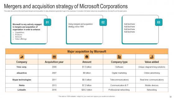 This slide shows how Microsoft used mergers and acquisition to stay ahead and generate huge in the business. It includes information about key acquisitions by Microsoft over the past years. Are you searching for a Mergers And Acquisition Strategy Of Microsoft Strategic Advancements By Microsofts Brochure Pdf that is uncluttered, straightforward, and original Its easy to edit, and you can change the colors to suit your personal or business branding. For a presentation that expresses how much effort you have put in, this template is ideal With all of its features, including tables, diagrams, statistics, and lists, its perfect for a business plan presentation. Make your ideas more appealing with these professional slides. Download Mergers And Acquisition Strategy Of Microsoft Strategic Advancements By Microsofts Brochure Pdf from Slidegeeks today. This slide shows how Microsoft used mergers and acquisition to stay ahead and generate huge in the business. It includes information about key acquisitions by Microsoft over the past years.
