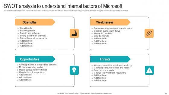 This slide shows detailed analysis of Microsoft corporations to identify various factors affecting its business either positively or negatively. It includes strengths, weaknesses, opportunities and threats. Slidegeeks is here to make your presentations a breeze with SWOT Analysis To Understand Internal Factors Strategic Advancements By Microsofts Topics Pdf With our easy-to-use and customizable templates, you can focus on delivering your ideas rather than worrying about formatting. With a variety of designs to choose from, you are sure to find one that suits your needs. And with animations and unique photos, illustrations, and fonts, you can make your presentation pop. So whether you are giving a sales pitch or presenting to the board, make sure to check out Slidegeeks first This slide shows detailed analysis of Microsoft corporations to identify various factors affecting its business either positively or negatively. It includes strengths, weaknesses, opportunities and threats.