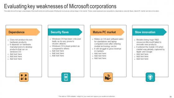 This slide shows five major weaknesses of Microsoft which are continuously effecting its revenues as well as image in the market. These weaknesses are poor acquisitions, dependance, security flaws, mature PC market and slow innovation. If you are looking for a format to display your unique thoughts, then the professionally designed Evaluating Key Weaknesses Of Microsoft Strategic Advancements By Microsofts Microsoft Pdf is the one for you. You can use it as a Google Slides template or a PowerPoint template. Incorporate impressive visuals, symbols, images, and other charts. Modify or reorganize the text boxes as you desire. Experiment with shade schemes and font pairings. Alter, share or cooperate with other people on your work. Download Evaluating Key Weaknesses Of Microsoft Strategic Advancements By Microsofts Microsoft Pdf and find out how to give a successful presentation. Present a perfect display to your team and make your presentation unforgettable. This slide shows five major weaknesses of Microsoft which are continuously effecting its revenues as well as image in the market. These weaknesses are poor acquisitions, dependance, security flaws, mature PC market and slow innovation.