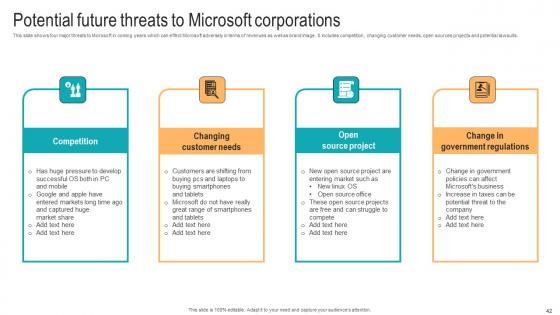 This slide shows four major threats to Microsoft in coming years which can effect Microsoft adversely in terms of revenues as well as brand image. It includes competition, changing customer needs, open sources projects and potential lawsuits. Do you know about Slidesgeeks Potential Future Threats To Microsoft Strategic Advancements By Microsofts Microsoft Pdf These are perfect for delivering any kind od presentation. Using it, create PowerPoint presentations that communicate your ideas and engage audiences. Save time and effort by using our pre-designed presentation templates that are perfect for a wide range of topic. Our vast selection of designs covers a range of styles, from creative to business, and are all highly customizable and easy to edit. Download as a PowerPoint template or use them as Google Slides themes. This slide shows four major threats to Microsoft in coming years which can effect Microsoft adversely in terms of revenues as well as brand image. It includes competition, changing customer needs, open sources projects and potential lawsuits.