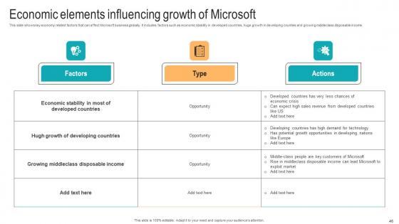 This slide shows key economy related factors that can affect Microsoft business globally. It includes factors such as economic stability in developed countries, huge growth in developing counties and growing middleclass disposable income. If your project calls for a presentation, then Slidegeeks is your go-to partner because we have professionally designed, easy-to-edit templates that are perfect for any presentation. After downloading, you can easily edit Economic Elements Influencing Growth Of Strategic Advancements By Microsofts Inspiration Pdf and make the changes accordingly. You can rearrange slides or fill them with different images. Check out all the handy templates This slide shows key economy related factors that can affect Microsoft business globally. It includes factors such as economic stability in developed countries, huge growth in developing counties and growing middleclass disposable income.