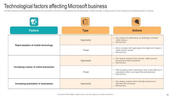 This slide represents key technological elements that can have huge impact on Microsoft. It includes elements such as rapid adoption of mobile technology, increasing volume of online transactions and increasing automation in business. Find highly impressive Technological Factors Affecting Microsoft Business Strategic Advancements By Microsofts Ideas Pdf on Slidegeeks to deliver a meaningful presentation. You can save an ample amount of time using these presentation templates. No need to worry to prepare everything from scratch because Slidegeeks experts have already done a huge research and work for you. You need to download Technological Factors Affecting Microsoft Business Strategic Advancements By Microsofts Ideas Pdf for your upcoming presentation. All the presentation templates are 100 percent editable and you can change the color and personalize the content accordingly. Download now This slide represents key technological elements that can have huge impact on Microsoft. It includes elements such as rapid adoption of mobile technology, increasing volume of online transactions and increasing automation in business.