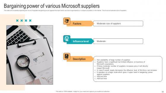 This slide shows details regarding the force of suppliers bargaining power against Microsoft which can have huge impacts on companys position in the market. This force is moderate size of suppliers. Want to ace your presentation in front of a live audience Our Bargaining Power Of Various Microsoft Strategic Advancements By Microsofts Summary Pdf can help you do that by engaging all the users towards you. Slidegeeks experts have put their efforts and expertise into creating these impeccable powerpoint presentations so that you can communicate your ideas clearly. Moreover, all the templates are customizable, and easy-to-edit and downloadable. Use these for both personal and commercial use. This slide shows details regarding the force of suppliers bargaining power against Microsoft which can have huge impacts on companys position in the market. This force is moderate size of suppliers.