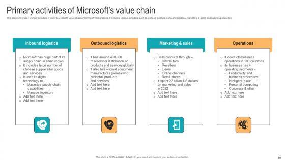 This slide shows key primary activities in order to evaluate value chain of Microsoft corporations. It includes various activities such as inbound logistics, outbound logistics, marketing and sales and business operation. Find a pre-designed and impeccable Primary Activities Of Microsofts Value Chain Strategic Advancements By Microsofts Elements Pdf. The templates can ace your presentation without additional effort. You can download these easy-to-edit presentation templates to make your presentation stand out from others. So, what are you waiting for Download the template from Slidegeeks today and give a unique touch to your presentation. This slide shows key primary activities in order to evaluate value chain of Microsoft corporations. It includes various activities such as inbound logistics, outbound logistics, marketing and sales and business operation.