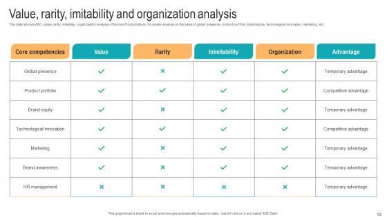 This slide shows VRIO value, rarity, imitability, organization analysis of Microsoft corporations. It includes analysis on the basis of global presence, product portfolio, brand equity, technological innovation, marketing, etc. Crafting an eye-catching presentation has never been more straightforward. Let your presentation shine with this tasteful yet straightforward Value Rarity Imitability And Organization Analysis Strategic Advancements By Microsofts Topics Pdf template. It offers a minimalistic and classy look that is great for making a statement. The colors have been employed intelligently to add a bit of playfulness while still remaining professional. Construct the ideal Value Rarity Imitability And Organization Analysis Strategic Advancements By Microsofts Topics Pdf that effortlessly grabs the attention of your audience Begin now and be certain to wow your customers This slide shows VRIO value, rarity, imitability, organization analysis of Microsoft corporations. It includes analysis on the basis of global presence, product portfolio, brand equity, technological innovation, marketing, etc.