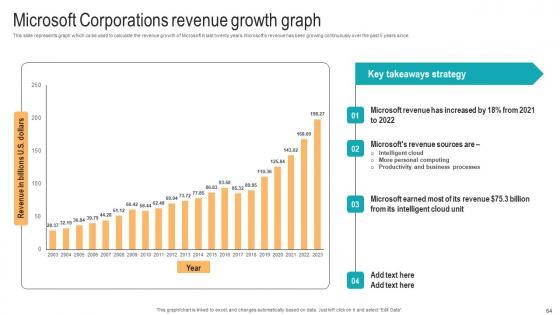 This slide represents graph which ca be used to calculate the revenue growth of Microsoft in last twenty years. Microsofts revenue has been growing continuously over the past 5 years since. Presenting this PowerPoint presentation, titled Microsoft Corporations Revenue Growth Graph Strategic Advancements By Microsofts Diagrams Pdf, with topics curated by our researchers after extensive research. This editable presentation is available for immediate download and provides attractive features when used. Download now and captivate your audience. Presenting this Microsoft Corporations Revenue Growth Graph Strategic Advancements By Microsofts Diagrams Pdf. Our researchers have carefully researched and created these slides with all aspects taken into consideration. This is a completely customizable Microsoft Corporations Revenue Growth Graph Strategic Advancements By Microsofts Diagrams Pdf that is available for immediate downloading. Download now and make an impact on your audience. Highlight the attractive features available with our PPTs. This slide represents graph which ca be used to calculate the revenue growth of Microsoft in last twenty years. Microsofts revenue has been growing continuously over the past 5 years since.