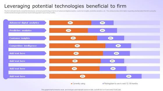 The firm will optimize its overall functioning by embracing technology in terms of advanced digital analytics, customer insights, predictive analytics, etc. This slide provides information regarding at what extent the firm using the mentioned technologies and how much it will upgrade in upcoming months. Slidegeeks is here to make your presentations a breeze with Digitization Framework For Technology Advancement Leveraging Potential Technologies Beneficial To Firm Download PDF With our easy to use and customizable templates, you can focus on delivering your ideas rather than worrying about formatting. With a variety of designs to choose from, you are sure to find one that suits your needs. And with animations and unique photos, illustrations, and fonts, you can make your presentation pop. So whether you are giving a sales pitch or presenting to the board, make sure to check out Slidegeeks first.