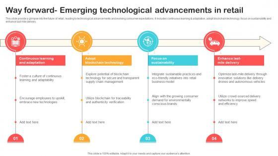 This slide provide a glimpse into the future of retail, leading to technological advancements and evolving consumer expectations. It includes continuous learning and adaptation, adopt blockchain technology, focus on sustainability and enhance last mile delivery. Slidegeeks is here to make your presentations a breeze with Way Forward Emerging Technological Advancements Optimizing Retail Operations With Digital DT SS V With our easy-to-use and customizable templates, you can focus on delivering your ideas rather than worrying about formatting. With a variety of designs to choose from, you are sure to find one that suits your needs. And with animations and unique photos, illustrations, and fonts, you can make your presentation pop. So whether you are giving a sales pitch or presenting to the board, make sure to check out Slidegeeks first This slide provide a glimpse into the future of retail, leading to technological advancements and evolving consumer expectations. It includes continuous learning and adaptation, adopt blockchain technology, focus on sustainability and enhance last mile delivery.
