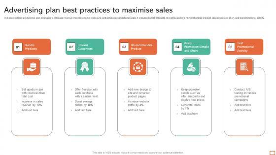 This slide outlines promotional plan strategies to increase revenue, maximize market exposure, and achieve organizational goals. It includes bundle products, reward customers, re merchandise product, keep simple and short, and test promotional activity. Showcasing this set of slides titled Advertising Plan Best Practices To Maximise Sales Demonstration Pdf. The topics addressed in these templates are Bundle Products, Reward Customers, Promotional Activity. All the content presented in this PPT design is completely editable. Download it and make adjustments in color, background, font etc. as per your unique business setting. This slide outlines promotional plan strategies to increase revenue, maximize market exposure, and achieve organizational goals. It includes bundle products, reward customers, re merchandise product, keep simple and short, and test promotional activity.