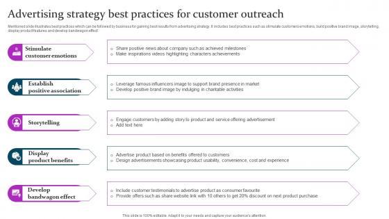 Mentioned slide illustrates best practices which can be followed by business for gaining best results from advertising strategy. It includes best practices such as stimulate customers emotions, build positive brand image, storytelling, display product features and develop bandwagon effect. If you are looking for a format to display your unique thoughts, then the professionally designed Advertising Strategy Best Practices For Customer Outreach Diagrams PDF is the one for you. You can use it as a Google Slides template or a PowerPoint template. Incorporate impressive visuals, symbols, images, and other charts. Modify or reorganize the text boxes as you desire. Experiment with shade schemes and font pairings. Alter, share or cooperate with other people on your work. Download Advertising Strategy Best Practices For Customer Outreach Diagrams PDF and find out how to give a successful presentation. Present a perfect display to your team and make your presentation unforgettable.