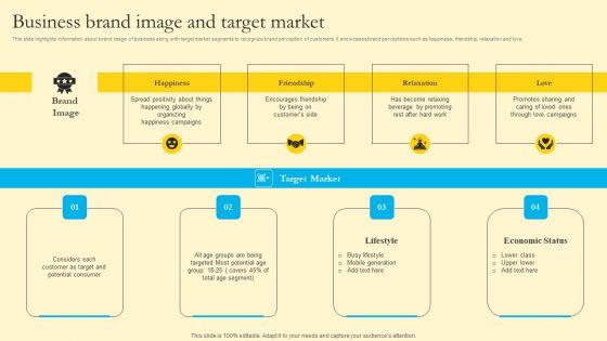 This slide highlights information about brand image of business along with target market segments to recognize brand perception of customers. It showcases brand perceptions such as happiness, friendship, relaxation and love. The Comprehensive Guide For Sales And Advertising Processes Business Brand Image And Target Market Microsoft PDF is a compilation of the most recent design trends as a series of slides. It is suitable for any subject or industry presentation, containing attractive visuals and photo spots for businesses to clearly express their messages. This template contains a variety of slides for the user to input data, such as structures to contrast two elements, bullet points, and slides for written information. Slidegeeks is prepared to create an impression.