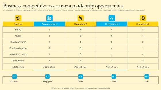The slide displays a competitive analysis matrix based on various factors to identify opportunities to grow in business. It includes factors such as pricing, quality, brand awareness, branding strategies, advertising spend and quick delivery. Are you searching for a Comprehensive Guide For Sales And Advertising Processes Business Competitive Assessment Identify Opportunities Guidelines PDF that is uncluttered, straightforward, and original Its easy to edit, and you can change the colors to suit your personal or business branding. For a presentation that expresses how much effort you have put in, this template is ideal With all of its features, including tables, diagrams, statistics, and lists, its perfect for a business plan presentation. Make your ideas more appealing with these professional slides. Download Comprehensive Guide For Sales And Advertising Processes Business Competitive Assessment Identify Opportunities Guidelines PDF from Slidegeeks today.