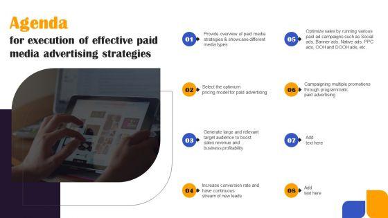 Find a pre designed and impeccable Agenda For Execution Of Effective Paid Media Advertising Strategies Rules PDF. The templates can ace your presentation without additional effort. You can download these easy to edit presentation templates to make your presentation stand out from others. So, what are you waiting for Download the template from Slidegeeks today and give a unique touch to your presentation.