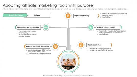 Following slide provides information about company adopted affiliated marketing software. It includes key elements such as dashboard, conversion tracking, impression tracking, organic tracking, and updated mobile app.Want to ace your presentation in front of a live audience Our Adopting Affiliate Marketing Tools With Purpose Comprehensive Guide For Marketing Technology can help you do that by engaging all the users towards you. Slidegeeks experts have put their efforts and expertise into creating these impeccable powerpoint presentations so that you can communicate your ideas clearly. Moreover, all the templates are customizable, and easy-to-edit and downloadable. Use these for both personal and commercial use. Following slide provides information about company adopted affiliated marketing software. It includes key elements such as dashboard, conversion tracking, impression tracking, organic tracking, and updated mobile app.