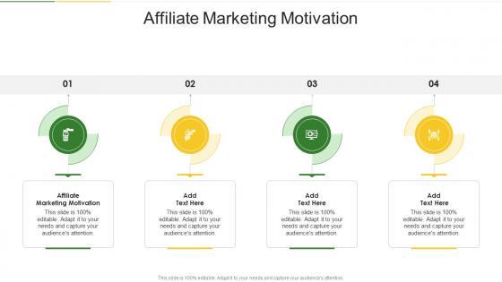 Introducing our well designed Affiliate Marketing Motivation In Powerpoint And Google Slides Cpb. This PowerPoint design presents information on topics like Affiliate Marketing Motivation. As it is predesigned it helps boost your confidence level. It also makes you a better presenter because of its high quality content and graphics. This PPT layout can be downloaded and used in different formats like PDF, PNG, and JPG. Not only this, it is available in both Standard Screen and Widescreen aspect ratios for your convenience. Therefore, click on the download button now to persuade and impress your audience. Our Affiliate Marketing Motivation In Powerpoint And Google Slides Cpb are topically designed to provide an attractive backdrop to any subject. Use them to look like a presentation pro.