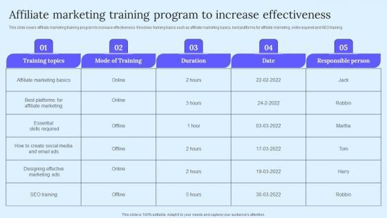 This slide covers affiliate marketing training program to increase effectiveness. It involves training topics such as affiliate marketing basics, best platforms for affiliate marketing, skills required and SEO training. Boost your pitch with our creative Affiliate Marketing Training B2B Marketing Techniques To Attract Potential Template Pdf. Deliver an awe inspiring pitch that will mesmerize everyone. Using these presentation templates you will surely catch everyones attention. You can browse the ppts collection on our website. We have researchers who are experts at creating the right content for the templates. So you do not have to invest time in any additional work. Just grab the template now and use them. This slide covers affiliate marketing training program to increase effectiveness. It involves training topics such as affiliate marketing basics, best platforms for affiliate marketing, skills required and SEO training.