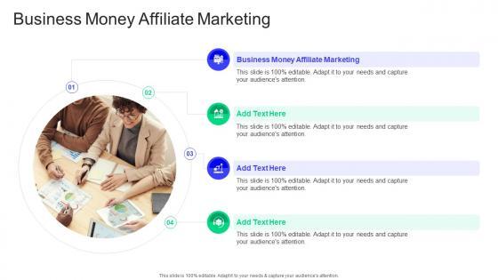 Introducing our well designed Business Money Affiliate Marketing In Powerpoint And Google Slides Cpb. This PowerPoint design presents information on topics like Business Money Affiliate Marketing. As it is predesigned it helps boost your confidence level. It also makes you a better presenter because of its high quality content and graphics. This PPT layout can be downloaded and used in different formats like PDF, PNG, and JPG. Not only this, it is available in both Standard Screen and Widescreen aspect ratios for your convenience. Therefore, click on the download button now to persuade and impress your audience. Our Business Money Affiliate Marketing In Powerpoint And Google Slides Cpb are topically designed to provide an attractive backdrop to any subject. Use them to look like a presentation pro.
