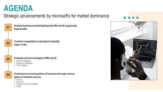 Boost your pitch with our creative Agenda Strategic Advancements By Microsofts For Market Dominance Diagrams Pdf. Deliver an awe-inspiring pitch that will mesmerize everyone. Using these presentation templates you will surely catch everyones attention. You can browse the ppts collection on our website. We have researchers who are experts at creating the right content for the templates. So you do not have to invest time in any additional work. Just grab the template now and use them. Our Agenda Strategic Advancements By Microsofts For Market Dominance Diagrams Pdf are topically designed to provide an attractive backdrop to any subject. Use them to look like a presentation pro.
