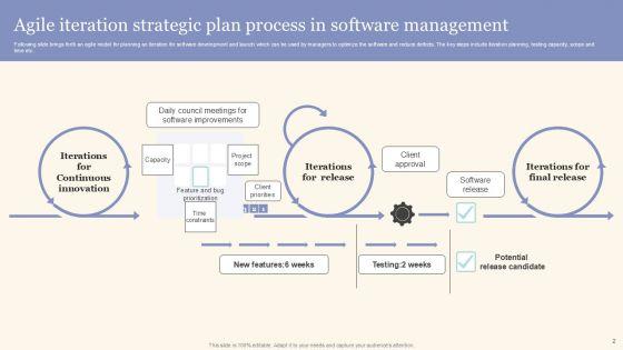 Following slide brings forth an agile model for planning an iteration for software development and launch which can be used by managers to optimize the software and reduce defects. The key steps include iteration planning, testing capacity, scope and time etc. Presenting Agile Iteration Strategic Plan Process In Software Management Designs PDF to dispense important information. This template comprises three stages. It also presents valuable insights into the topics including Iterations For Continuous Innovation, Iterations For Release, Potential Release Candidate. This is a completely customizable PowerPoint theme that can be put to use immediately. So, download it and address the topic impactfully.