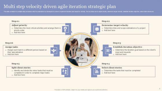 This slide consists of a multiple step procedure which is undertaken by developers in order to implement iteration plan based on velocity. The key steps are to adjust priority, determine target velocity, establish iteration objective, select client stories etc. Presenting Multi Step Velocity Driven Agile Iteration Strategic Plan Download PDF to dispense important information. This template comprises six stages. It also presents valuable insights into the topics including Adjust Priority, Assign Tasks, Split Client Stories, Select Client Stories, Establish Iteration Objective. This is a completely customizable PowerPoint theme that can be put to use immediately. So, download it and address the topic impactfully.
