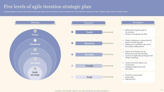 This slide illustrates a five level model which is used by organizations which are planning to launch an iteration plan. The key elements of planning are vision, roadmap, release, iteration and daily meetups. Presenting Five Levels Of Agile Iteration Strategic Plan Download PDF to dispense important information. This template comprises five stages. It also presents valuable insights into the topics including Planning, Vision, Roadmap, Release, Iteration. This is a completely customizable PowerPoint theme that can be put to use immediately. So, download it and address the topic impactfully.