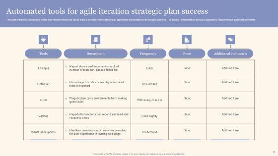This slide presents a comparison matrix that project owners can use to make a decision when selecting an appropriate automated tool for iteration planning. The basis of differentiation are tools, description, frequency and additional comments. Showcasing this set of slides titled Automated Tools For Agile Iteration Strategic Plan Success Inspiration PDF. The topics addressed in these templates are Tools, Description, Frequency, Price, Additional Comments. All the content presented in this PPT design is completely editable. Download it and make adjustments in color, background, font etc. as per your unique business setting.