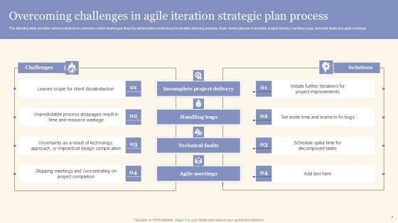 The following slide provides various solutions to overcome critical challenges faced by stakeholders performing the iteration planning process. Major challenges are incomplete project delivery, handling bugs, technical faults and agile meetings. Presenting Overcoming Challenges In Agile Iteration Strategic Plan Process Rules PDF to dispense important information. This template comprises four stages. It also presents valuable insights into the topics including Challenges, Solutions. This is a completely customizable PowerPoint theme that can be put to use immediately. So, download it and address the topic impactfully.