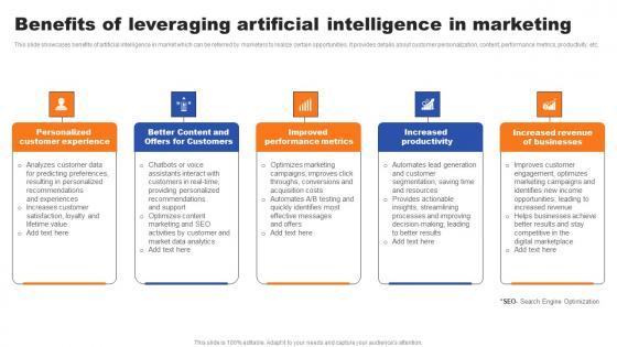 This slide showcases benefits of artificial intelligence in market which can be referred by marketers to realize certain opportunities. It provides details about customer personalization, content, performance metrics, productivity, etc. Present like a pro with Benefits Of Leveraging Artificial Intelligence In Marketing Ppt Gallery Graphics Design PDF Create beautiful presentations together with your team, using our easy-to-use presentation slides. Share your ideas in real-time and make changes on the fly by downloading our templates. So whether you are in the office, on the go, or in a remote location, you can stay in sync with your team and present your ideas with confidence. With Slidegeeks presentation got a whole lot easier. Grab these presentations today. This slide showcases benefits of artificial intelligence in market which can be referred by marketers to realize certain opportunities. It provides details about customer personalization, content, performance metrics, productivity, etc.