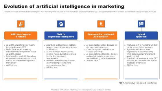 This slide showcases evolution of artificial intelligence AI in marketing, which can guide and help marketers in adoption of this technology. It provides details about hype to rethink, augmented intelligence, innovation, hybrid, etc. Do you have to make sure that everyone on your team knows about any specific topic I yes, then you should give Evolution Of Artificial Intelligence In Marketing Ppt Infographics Influencers Pdf a try. Our experts have put a lot of knowledge and effort into creating this impeccable Evolution Of Artificial Intelligence In Marketing Ppt Infographics Influencers Pdf. You can use this template for your upcoming presentations, as the slides are perfect to represent even the tiniest detail. You can download these templates from the Slidegeeks website and these are easy to edit. So grab these today This slide showcases evolution of artificial intelligence AI in marketing, which can guide and help marketers in adoption of this technology. It provides details about hype to rethink, augmented intelligence, innovation, hybrid, etc.