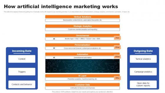 This slide showcases a framework guiding how AI actually works with respect to key marketing activities. It provides details about vertical solutions, strategic analytics, omnichannel, automation, AI layer, etc. From laying roadmaps to briefing everything in detail, our templates are perfect for you. You can set the stage with your presentation slides. All you have to do is download these easy-to-edit and customizable templates. HHow Artificial Intelligence Marketing Works Ppt Pictures Aids Pdf will help you deliver an outstanding performance that everyone would remember and praise you for. Do download this presentation today. This slide showcases a framework guiding how AI actually works with respect to key marketing activities. It provides details about vertical solutions, strategic analytics, omnichannel, automation, AI layer, etc.