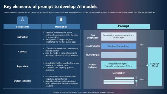 The purpose of this slide is to discuss the structure of a prompt created to develop and refine artificial intelligence models. The components of prompt formation include instruction, context, input data, and output indicator. Are you searching for a Key Elements Of Prompt To Develop AI Models Inspiration Pdf that is uncluttered, straightforward, and original Its easy to edit, and you can change the colors to suit your personal or business branding. For a presentation that expresses how much effort you have put in, this template is ideal With all of its features, including tables, diagrams, statistics, and lists, its perfect for a business plan presentation. Make your ideas more appealing with these professional slides. Download Key Elements Of Prompt To Develop AI Models Inspiration Pdf from Slidegeeks today. The purpose of this slide is to discuss the structure of a prompt created to develop and refine artificial intelligence models. The components of prompt formation include instruction, context, input data, and output indicator.