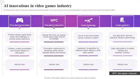 The purpose of this slide is to showcase AI advancements in gaming industry. It covers various trends such as procedural generation, non player character, game balancing and game analytics.Pitch your topic with ease and precision using this AI Innovations In Video Games Industry Clipart Pdf This layout presents information on Procedural Generation, Enhance Content Possibilities, Balanced Match Making It is also available for immediate download and adjustment. So, changes can be made in the color, design, graphics or any other component to create a unique layout. The purpose of this slide is to showcase AI advancements in gaming industry. It covers various trends such as procedural generation, non player character, game balancing and game analytics.