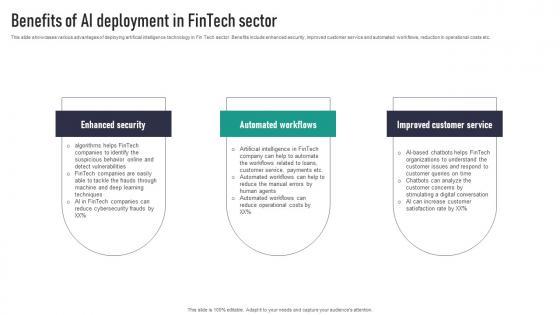 This slide showcases various advantages of deploying artificial intelligence technology in fin tech sector. Benefits include enhanced security, improved customer service and automated workflows, reduction in operational costs etc.Here you can discover an assortment of the finest PowerPoint and Google Slides templates. With these templates, you can create presentations for a variety of purposes while simultaneously providing your audience with an eye-catching visual experience. Download Benefits Of Ai Deployment In Fintech Sector Artificial Intelligence Applications Icons Pdf to deliver an impeccable presentation. These templates will make your job of preparing presentations much quicker, yet still, maintain a high level of quality. Slidegeeks has experienced researchers who prepare these templates and write high-quality content for you. Later on, you can personalize the content by editing the Benefits Of Ai Deployment In Fintech Sector Artificial Intelligence Applications Icons Pdf. This slide showcases various advantages of deploying artificial intelligence technology in fin tech sector. Benefits include enhanced security, improved customer service and automated workflows, reduction in operational costs etc.