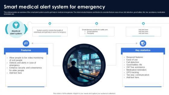 This slide provides an overview of the smart alert system used to get help in medical emergencies. The slide includes features and factors to consider that are ease of use, fall detection, good battery life, live assistance, medication reminders, etc. Take your projects to the next level with our ultimate collection of Optimization Of IoT Remote Monitoring Smart Medical Alert System For Emergency IoT SS V. Slidegeeks has designed a range of layouts that are perfect for representing task or activity duration, keeping track of all your deadlines at a glance. Tailor these designs to your exact needs and give them a truly corporate look with your own brand colors they will make your projects stand out from the rest This slide provides an overview of the smart alert system used to get help in medical emergencies. The slide includes features and factors to consider that are ease of use, fall detection, good battery life, live assistance, medication reminders, etc.