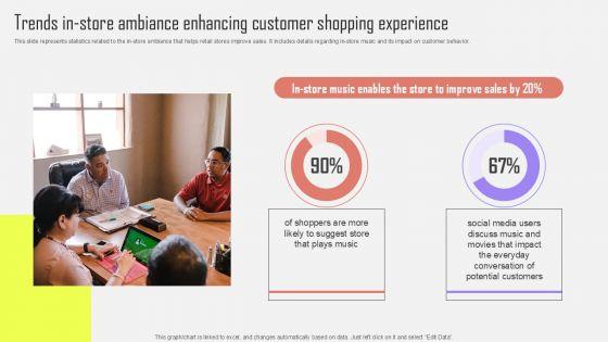 This slide represents statistics related to the in-store ambiance that helps retail stores improve sales. It includes details regarding in-store music and its impact on customer behavior. If your project calls for a presentation, then Slidegeeks is your go to partner because we have professionally designed, easy to edit templates that are perfect for any presentation. After downloading, you can easily edit Trends In Store Ambiance Enhancing Customer Shopping Experience Slides PDF and make the changes accordingly. You can rearrange slides or fill them with different images. Check out all the handy templates.