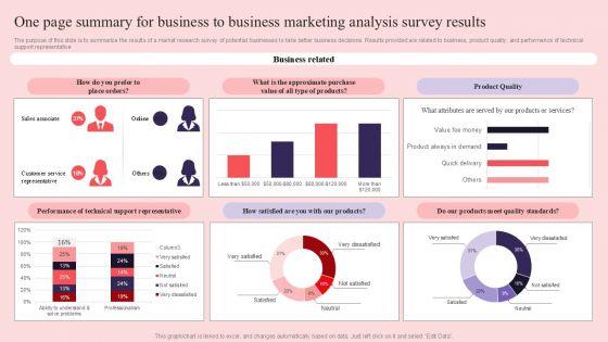 The purpose of this slide is to summarize the results of a market research survey of potential businesses to take better business decisions. Results provided are related to business, product quality, and performance of technical support representative. Pitch your topic with ease and precision using this One Page Summary For Business To Business Marketing Analysis Survey Results Survey SS. This layout presents information on Business Related, Product Quality, Performance Of Technical, Quality Standards. It is also available for immediate download and adjustment. So, changes can be made in the color, design, graphics or any other component to create a unique layout.