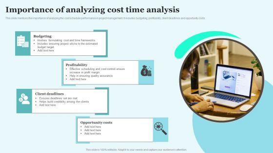 This slide mentions the importance of analyzing the cost schedule performance in project management. It includes budgeting, profitability, client deadlines and opportunity costs. Presenting Importance Of Analyzing Cost Time Analysis Elements PDF to dispense important information. This template comprises four stages. It also presents valuable insights into the topics including Profitability, Client Deadlines, Opportunity Costs. This is a completely customizable PowerPoint theme that can be put to use immediately. So, download it and address the topic impactfully.