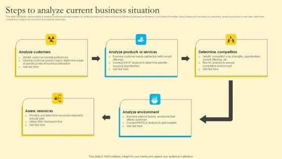 This slide highlights various steps to assess existing business position for analyzing internal and external factors affecting business performance. It provides information about steps such as analyze customers, analyze products or services, determine competitors, analyze environment and assess resources. Here you can discover an assortment of the finest PowerPoint and Google Slides templates. With these templates, you can create presentations for a variety of purposes while simultaneously providing your audience with an eye-catching visual experience. Download Comprehensive Guide For Sales And Advertising Processes Steps To Analyze Current Business Situation Ideas PDF to deliver an impeccable presentation. These templates will make your job of preparing presentations much quicker, yet still, maintain a high level of quality. Slidegeeks has experienced researchers who prepare these templates and write high-quality content for you. Later on, you can personalize the content by editing the Comprehensive Guide For Sales And Advertising Processes Steps To Analyze Current Business Situation Ideas PDF.