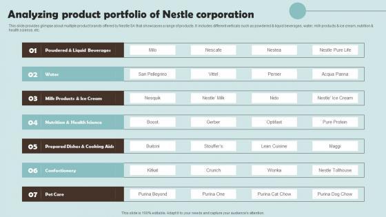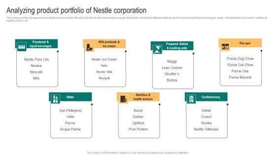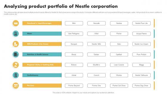 This slide provides glimpse about multiple product brands offered by Nestle SA that showcases a range of products. It includes different verticals such as powdered and liquid beverages, water, milk products and ice cream, nutrition and health science, etc. Get a simple yet stunning designed Packaged Food Business Analyzing Product Portfolio Of Nestle Corporation Slides Pdf It is the best one to establish the tone in your meetings. It is an excellent way to make your presentations highly effective. So, download this PPT today from Slidegeeks and see the positive impacts. Our easy-to-edit Packaged Food Business Analyzing Product Portfolio Of Nestle Corporation Slides Pdf can be your go-to option for all upcoming conferences and meetings. So, what are you waiting for Grab this template today. This slide provides glimpse about multiple product brands offered by Nestle SA that showcases a range of products. It includes different verticals such as powdered and liquid beverages, water, milk products and ice cream, nutrition and health science, etc.