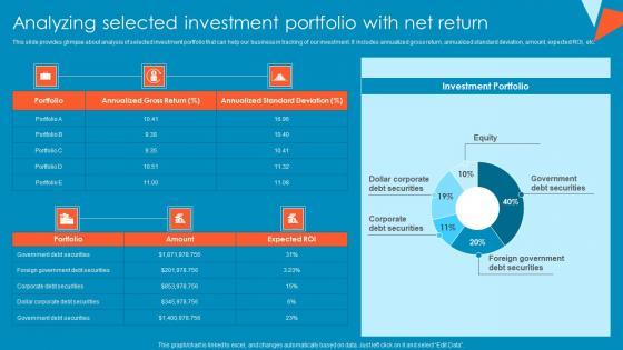 This slide provides glimpse about analysis of selected investment portfolio that can help our business in tracking of our investment. It includes annualized gross return, annualized standard deviation, amount, expected ROI, etc. Formulating a presentation can take up a lot of effort and time, so the content and message should always be the primary focus. The visuals of the PowerPoint can enhance the presenters message, so our Adjusting Financial Strategies And Planning Analyzing Selected Investment Portfolio With Net Return Information PDF was created to help save time. Instead of worrying about the design, the presenter can concentrate on the message while our designers work on creating the ideal templates for whatever situation is needed. Slidegeeks has experts for everything from amazing designs to valuable content, we have put everything into Adjusting Financial Strategies And Planning Analyzing Selected Investment Portfolio With Net Return Information PDF
