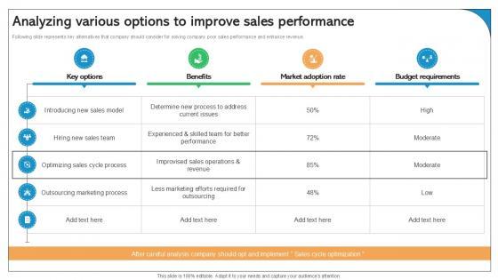 Following slide represents key alternatives that company should consider for solving company poor sales performance and enhance revenue. Find highly impressive Analyzing Various Options To Improve Sales Performance Best Practices Ppt Presentation SA SS V on Slidegeeks to deliver a meaningful presentation. You can save an ample amount of time using these presentation templates. No need to worry to prepare everything from scratch because Slidegeeks experts have already done a huge research and work for you. You need to download Analyzing Various Options To Improve Sales Performance Best Practices Ppt Presentation SA SS V for your upcoming presentation. All the presentation templates are 100 percent editable and you can change the color and personalize the content accordingly. Download now Following slide represents key alternatives that company should consider for solving company poor sales performance and enhance revenue.