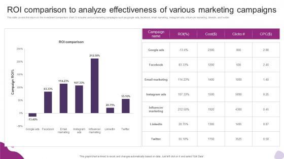 This slide covers the return on the investment comparison chart. It includes various marketing campaigns such as google ads, facebook, email marketing, instagram ads, influencer marketing, linkedin, and twitter. Are you in need of a template that can accommodate all of your creative concepts This one is crafted professionally and can be altered to fit any style. Use it with Google Slides or PowerPoint. Include striking photographs, symbols, depictions, and other visuals. Fill, move around, or remove text boxes as desired. Test out color palettes and font mixtures. Edit and save your work, or work with colleagues. Download Roi Comparison To Analyze Effectiveness Of Various Powerful Marketing Techniques Strategy SS V and observe how to make your presentation outstanding. Give an impeccable presentation to your group and make your presentation unforgettable. This slide covers the return on the investment comparison chart. It includes various marketing campaigns such as google ads, facebook, email marketing, instagram ads, influencer marketing, linkedin, and twitter.